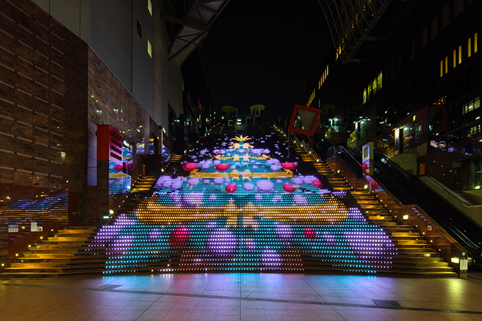 京都の玄関口として、訪れるお客様の気持ちを明るく照らしたいという思いを込め、京都駅ビル各所がイルミネーションで装飾されます。駅ビルの「大階段グラフィカルイルミネーションPlus」は、171段中125段に約15,000個のLEDがちりばめられ、季節感あふれるデザインがイルミネーションによって彩られています。雰囲気抜群の光のアートが楽しめる京都駅ビルで、ロマンチックにお過ごしください。 ※クリスマス演…